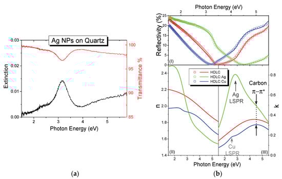 The transmittance and extinction spectra of the pure Ag NPs sample deposited on quartz are shown in Figure 5a. A distinct absorption peak is observed at 3.16 eV, which is due to LSPR of the metallic Ag NPs. The absorption value is well correlated with the LSPR absorption shown by similar sizes of Ag NPs [38]. This resonance originates from the collective oscillation of the free electrons of the NPs, and affected by the size of the NPs, the distance between them and the optical properties of the surround matrix [39]. The top of Figure 5b shows the measured experimental reflectivity of the HDLC; HDLC:Ag and HDLC:Cu thin films for 2:1 CH4/Ar ratio and their corresponding fit lines for each curve. All curves show a drop in the spectra between 3 and 4.5 eV, which is due to the evolution of a reflectivity fringe due to the transparency and the thickness of each sample; thicker samples would exhibit multiple reflectivity fringes in this range. The overlaid lines demonstrate the calculated reflectivities and all three curves show very good agreement to the experimental data.