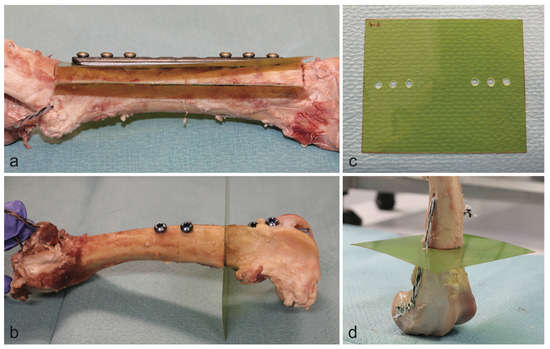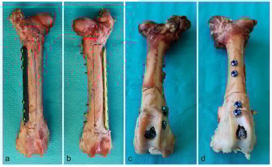 Bone preparation with plates (a: CF/PEEK, b: titanium) and intramedullary nails (c: CF/PEEK, d: titanium) in situ.