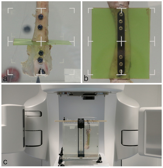 Specimen orientation within the water basin in the intramedullary nail model (a) and the plate model (b). Full setup within the linear accelerator (c).