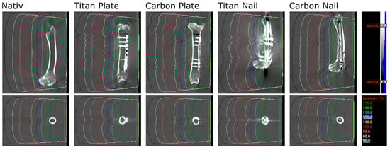 In orthopedic oncology, a surgical stabilization of the affected bone is often required after thorough assessment of the clinical context and prognostic factors [1]. The individual fracture risk of long bones metastases can be calculated using the Mirels’ score [2]. Radiation therapy is an important oncological adjunct in the management of these patients, especially when encountering multiple or osteolytic lesions. However, metallic implants show a dose-modulating effect in radiotherapy and complicate its CT-based planning [3,4]. During radiation therapy, intra or extramedullary implants might not only affect the surrounding tissue due to backscattering and inadvertent dose increase but might also compromise the therapeutic effect to the target lesion due to beam attenuation. Later on, follow-up imaging and the diagnosis of local recurrences is often obscured by metallic artefacts [5]. This is why radiolucent implant materials, in particular, for the use in orthopedic tumor patients, are increasingly being recognized [6,7]. While carbon fiber/polyether ether ketone (CF/PEEK) implants have already been examined biomechanically, data on their radiophysical properties are scarce [8,9,10,11].