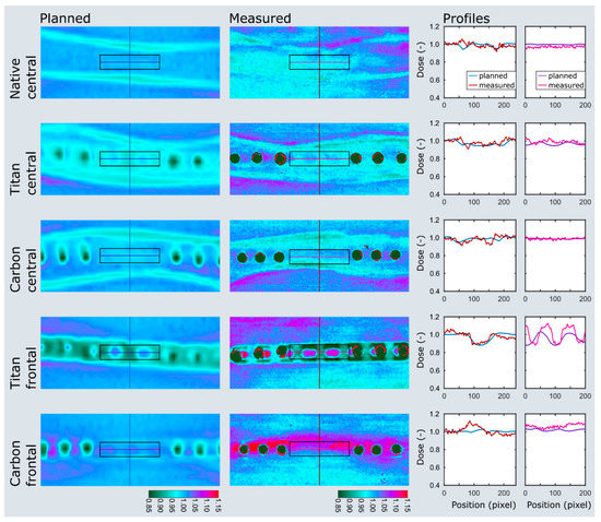 Dose plotting of the plate model at 5 cm immersion depth. The area of interest and profiles are depicted on the planned and measured dose distributions as black boxes and colored lines. Note the distinct dose attenuation at the implant–bone interface with titanium implants (titan frontal) when compared to CF/PEEK implants (carbon frontal). The dose range assimilates in the bone center but remains smaller in the CF/PEEK model (titan central vs. carbon central).
