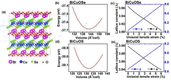 (a) Crystal structure of BiCuOSe. Variation of energy with respect to volume during optimizing structures of unstrained (b) BiCuOSe and (d) BiCuOS. The optimized lattice constants of (c) BiCuOSe and (e) BiCuOS as function of uniaxial tensile strain.