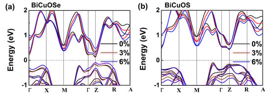 The characteristics of the band structure are relevant to the thermoelectric transport properties. To gain insight into the band structures tuned by uniaxial tensile strain, the band structures of BiCuOSe and BiCuOS with and without strain are plotted along several high symmetry points in the Brillion zone in Figure 2. The calculation results indicate that both the conduction band minimum and the valence band maximum are located at the Z point, meaning that BiCuOSe has a direct band gap. BiCuOS shows an indirect band gap, whose conduction band minimum is located at the Z point, but whose valence band maximum is located between the M point and Γ point. Of particular interest to us is n-type BiCuOCh, whose thermoelectric transport properties rely on conduction bands of band structures, allowing us to focus on the changes in conduction bands under uniaxial tensile strain. In Figure 2a, as the uniaxial tensile strain is increasing, the conduction band near Fermi level of BiCuOSe becomes flatter from Γ to Z direction, and the energy at M point is significantly decreased. It has been reported that variations in the conduction band may affect the transport properties of n-type BiCuOSe [38]. The changes in band structure of BiCuOS under tensile strain are similar to those of BiCuOSe under tensile strain. Note that the energy variations of conduction band at M point and Z point under strain have significant differences. The energy decreases more obviously at M point, whereas the energy increases mildly at Z point. Considering thermoelectric transport properties closely related to band structures, those changes in the conduction band near the Fermi level may influence the thermoelectric properties of n-type BiCuOSe and BiCuOS.