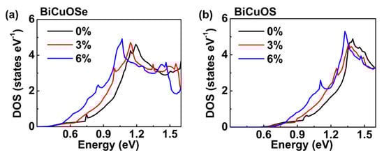For the unstrained state, both n-type BiCuOSe and BiCuOS have negative Seebeck coefficients, and the absolute values of the Seebeck coefficients decrease with the increase in electron concentration (Figure 6a,d), whereas the electrical conductivities increase (Figure 6b,e), as expected. Opposite trends in the variations of Seebeck coefficients and electrical conductivities with respect to electron concentration result in a peak with maximum value in power factor, as shown in Figure 6c,f. Comparing with n-type BiCuOS, n-type BiCuOSe possesses a lower Seebeck coefficient but a higher electrical conductivity. It is well known that the electronic conductivity of n-type thermoelectric materials is mainly dominated by the conduction band near Fermi level. Combining with the DOS curves in the conduction bands close to Fermi level shown in Figure 3, the slope of DOS curves of BiCuOS is steeper than that of BiCuOSe, suggesting that n-type BiCuOS has higher Seebeck coefficient than n-type BiCuOSe, whereas the trend in electrical conductivity is just opposite [39].