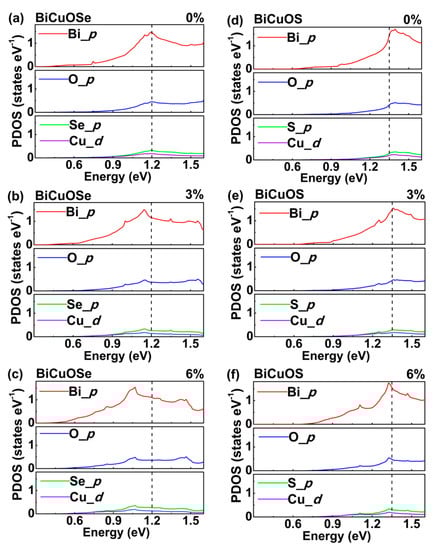 Projected density of states (PDOS) of (a–c) BiCuOSe and (d–f) BiCuOS subjected to different uniaxial tensile strains: (a,d) 0%, (b,e) 3%, and (c,f) 6%. The dash lines located at 1.2 eV for BiCuOSe and 1.35 eV for BiCuOS marked as guides for distinguishing the shifts of PDOS.