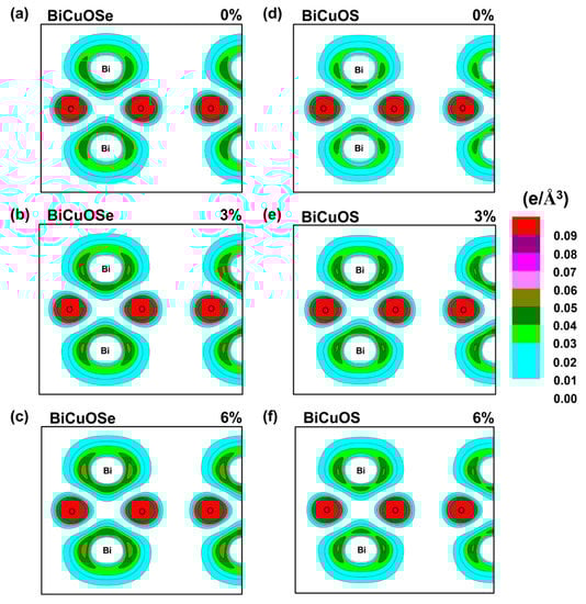 To further illustrate the influences of uniaxial tensile strain on the electrical conductivity of n-type BiCuOCh, the partial charge density near Fermi level of BiCuOSe and BiCuOS under different strain states are calculated and shown in Figure 5. The partial charge density distribution is usually used to explore the nature of electrical conductivity as reported in the references [39,40]. As the electronic transport properties of n-type BiCuOCh are determined by the conduction bands near Fermi level, only the distributions of charge of Bi atoms and O atoms of conduction bands near Fermi level (0 to 2 eV) are shown. From the partial charge density without strain in Figure 5a, we can see the obvious antibonding characteristics between Bi and Bi atoms due to the lack of charge density between them, which determines the electrical conductivity of n-type BiCuOCh, consistent with previous reports [16]. As the strain increases from 0 to 6%, as shown in Figure 5a–c, the charge densities around the Bi atoms slightly increases, suggesting that the antibonding of Bi–Bi becomes weakened slightly under strain, which can lead to a slight decreasing trend in electrical conductivity of n-type BiCuOSe under increasing uniaxial tensile strain. The trends of changes in partial charge density in n-type BiCuOS under strains are shown in Figure 5d–f. The scenarios for BiCuOS are similar and we will not discuss them in detail.