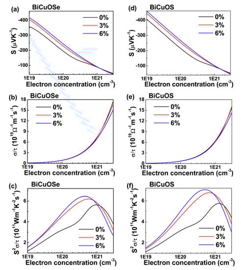 Thermoelectric properties of n-type (a–c) BiCuOSe and (d–f) BiCuOS as a function of electron concentration subject to different uniaxial tensile strains at 800 K. (a,d) Seebeck coefficient S, (b,e) electrical conductivity with respect to relaxation time σ/τ, and (c,f) power factors with respect to relaxation time S2σ/τ.