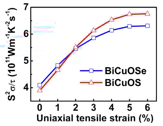 Power factors with respect to relaxation time S2σ/τ of n-type BiCuOSe and BiCuOS as a function of uniaxial tensile strain at 800 K with electron concentration being 3 × 1020 cm−3.