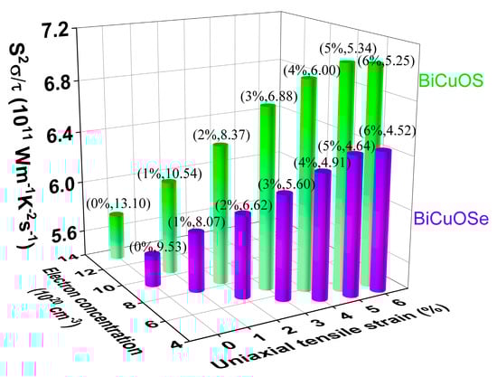 Thermoelectric properties are correlated with electronic structures. After examining the effects of uniaxial tensile strain on the electronic structures of BiCuOCh, we further investigate the effects of uniaxial tensile strain on the thermoelectric properties, which are estimated by solving the Boltzmann transport equation. Notice that the relaxation time τ cannot be determined via the Boltzmann theory. Similar to previous work [32], the electrical conductivity derived with respect to the relaxation time is obtained under the assumption of constant relaxation time. The thermoelectric properties of n-type BiCuOSe and BiCuOS as a function of electron concentration under different uniaxial tensile strains are shown in Figure 6, where the temperature is chosen at 800 K as BiCuOSe and BiCuOS belong to medium temperature thermoelectric materials [17,37].