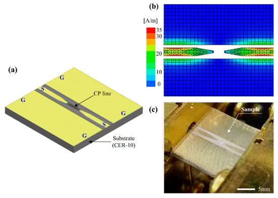 Figure 1b shows the average surface current distribution as the degree of microwave power transport, i.e., 50 Ω-impedance matching, in the bare CPW. As can be seen from the figure, the current becomes concentrated in the region between the ground and signal electrodes when the quasi-TEM mode is generated through the structure. Figure 1c depicts the sample image of the bare CPW through a commercially printed circuit board technique [23].