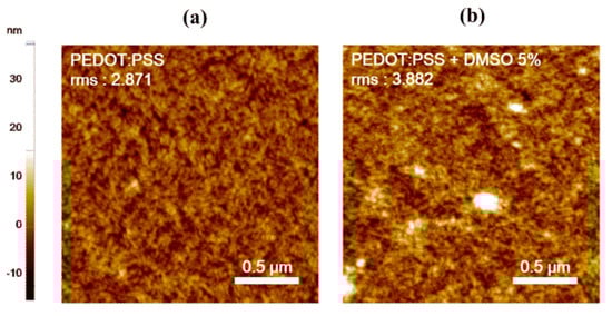 AFM images of PEDOT:PSS films: (a) pristine PEDOT:PSS and (b) PEDOT:PSS with DMSO.