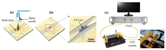 The surface roughness of the PEDOT:PSS films, treated with and without DMSO, was approximately 3.882 and 2.871 root-mean-square (rms), respectively. Next, the bare CPW was treated with oxygen plasma for 3 min to enhance the hydrophilicity of the surface. After that, a PEDOT:PSS solution doped with DMSO was sprayed, as shown in Figure 3a.