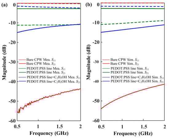 Figure 4a,b depicts the magnitude of the S-parameters of the simulated and measured samples at three sample configurations—a bare CPW, a CPW with a PEDOT:PSS line (ethanol-free PEDOT:PSS line), and a CPW with a PEDOT:PSS line exposed to ethanol gas (ethanol-exposed PEDOT:PSS line).