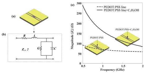 Impedance and distributed elements of the PEDOT:PSS line; (a) Schematic of CPW with a PEDOT:PSS line, (b) Transmission line (TL) circuit model of the CPW with a PEDOT:PSS line, (c) Magnitude of characteristic impedance.
