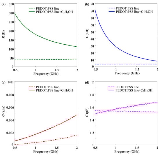 However, the of the ethanol-exposed sample dramatically decreased with increasing frequency. In addition, these samples gradually converged near 2 GHz. Figure 6a–d shows the difference of the distributed elements of the PEDOT:PSS line with and without ethanol gas in the observed frequency region.