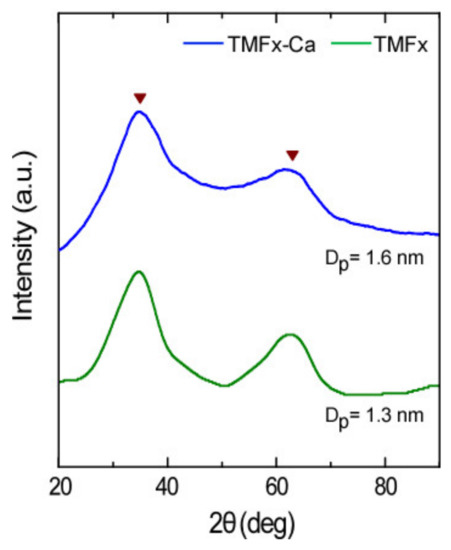XRD diagrams of TMFx and TMFx-Ca adsorbents. Triangles indicate the Mn-feroxyhyte diffraction angles, according to the ICDD/JCPDS database PDF#14-0557 [21]. The mean crystal size (Dp) values correspond to the calculated particle dimensions.