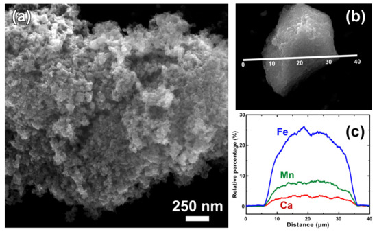 (a) Higher magnification FE-SEM image showing the nanoscale morphology of TMFx-Ca; (b) lower magnification FE-SEM image of one granule from this adsorbent; and (c) the respective elemental distribution of Fe, Mn, and Ca, as obtained by line-scan analysis in this granule.