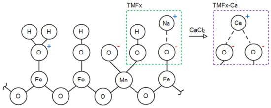 It has been shown that the surface charge density of TMFx adsorbent is related mainly to the protonation and deprotonation of oxygen atoms, without excluding also the case of neutral sites. During the preparation step under the applied alkaline conditions, the excess of OH− presence would favor the deprotonation of oxy-hydroxide surfaces, increasing the negative surface charge density [14]. On the other hand, during the preparation under acidic conditions, the excess of H+ presence can lead to an increased positive surface charge density [23]. Therefore, the pH conditions during the preparation of these adsorbents is expected to highly influence the specific type and density of TMFx surface charge (Figure S4). Furthermore, the contribution of other ions, which might be also present in the reactor during the synthesis procedure, cannot be considered as negligible. It is well-known that, by applying exchangeable ions, such as Na+, Ca2+, and SO42-, during the preparation step of adsorbents, the surface charge volume and distribution may be modified [14,24], and it can also be stabilized/maintained during the following drying process, as aforementioned. In fact, the surface H+ can be exchanged by other cations during the synthesis step, i.e., by Na+ in the TMFx case and by Ca2+ in the TMFx-Ca material [25]. The proposed surface complexation of examined materials (Figure 3) indicates that Na+ is weakly bound with one oxygen atom in the case of TMFx, while Ca2+ is attached to two atoms in the TMFx-Ca material, as dictated by the valence state of each exchangeable cation. In addition, the substitution of cations in the case of TMFx-Ca can be attributed to the lower affinity of Na+, as compared with Ca2+ [26]. As a result, the TMFx-Ca presented a slight increase of measured negative surface charge density from 1.8 to 2.0 mmol H+/g (Table 1), which, however, has shown significantly higher adsorption capacities, regarding the removal of the examined toxic metal cations (i.e., Cd and Pb).