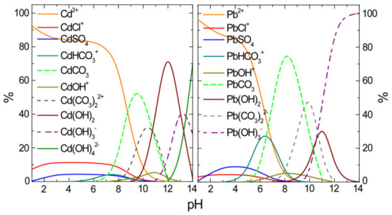 Apart from the adsorbent’s properties, the adsorption efficiency is also highly dependent on the adsorbate’s speciation. For this purpose, the speciation diagrams of Cd and Pb in NSF water matrix were designed, by using the Visual MINTEQ version 3.0 software (Figure 4). The composition of NSF water and the concentration of each of the examined pollutants were used as input for the respective program calculations.
