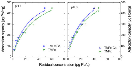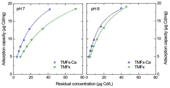 An increase of adsorption efficiency was observed at the pH value 8 for both adsorbents with Q5 values 7.29 μg Cd/mg for TMFx-Ca and 5.91 μg Cd/mg for TMFx. This increase was attributed to the enhanced negative surface charge density, due to the higher pH value since the IEP values of adsorbents were 3.6 and 5.9, respectively (Table 1). Furthermore, the variations in the affinity constants of the applied models (i.e., the n value for Freundlich and the KL for Langmuir) were proportional to the adsorption efficiency. However, it must be clarified that the Qmax values, resulting from the Langmuir equation, can be considered as indicative only, as they were calculated by the extrapolation of low equilibrium concentrations. These experimental data focus on achieving low residual concentrations (as imposed by the current legislation) in order to get more realistic evaluation of adsorption capacity for the cases of Cd (Q5) and Pb (Q10) and to predict the efficiency of this procedure in larger scale water treatment plants.