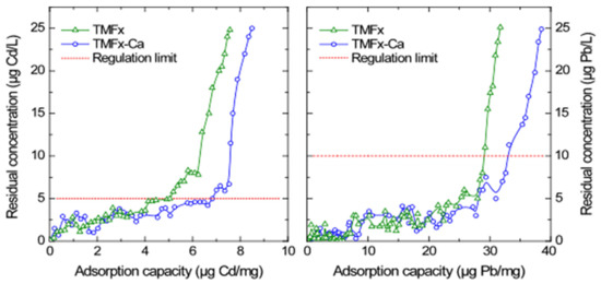 The saturated adsorbents after the end of RSSCT experiments were subsequently exposed to leaching experiments, following the typical procedure, as described in the EN 12457 protocol. The results shown in Table 5 indicate that, after use, both adsorbents could be further disposed as inert wastes, as their Cd and Pb contents are considered sufficiently stabilized. The recorded very low leachability values verify the rather high affinity of these metals, when removed by the TMFx or TMFx-Ca adsorbents and, furthermore, confirms that Pb removal can be attributed mainly to adsorption and not to its precipitation, because in the latter case this metal should present higher leachability values. In addition, the observed low values of leached calcium (<0.01 wt.%, Table 5) verify the active ion-exchange process, e.g., during cadmium and lead adsorption. These results were also confirmed by the fact that Ca2+ may present a higher affinity than Na+ for the surface of both sorbents, although this is still lower, when compared to other heavy metals, such as the examined Cd and Pb cases [31].