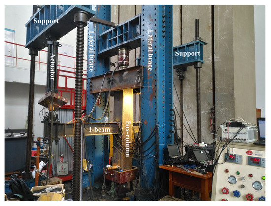 Three cruciform beam-to-column welded joints were designed in this experiment, in which the inflection point of the beam-to-column connection was selected. The column had box sections with a size of 300 × 300 × 16 × 16 (mm) and had a height of 2 m. The beam had an I-shaped cross-section with a size of 250 × 150 × 8 × 10 (mm) and a beam length of 1.35 m. The weld form between the beam flange and the column flange was a full penetration groove using ER50-6 gas shielded welding wire. Welding process quality inspection was performed using a digital ultrasonic flaw detector; the grade of the weld seam was I. The beam-to-column welded joint specimens and welded structural details are shown in Figure 4.