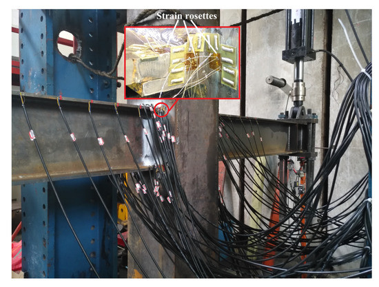 According to the numerical simulation results of ABAQUS finite element analysis, the cruciform I-beam to box-column welded joint is in yield state when the displacement is greater than 12 mm, which is the noted yield displacement. It can be seen from Figure 6 that at time moment t = 2.141s, when the simulation is controlled by yield displacement, the model has maximum von Mises stress at the weld roots of the upper and bottom flanges with a stress value of 255.2 MPa, which is greater than the yield strength value shown in Table 1. This indicates that the weld zone is in the stage of plastic deformation and the weld root on the beam flange plate of the welded connection is in a position of potential fatigue failure. Hence, strain rosettes are arranged in the vicinity of the dangerous position to obtain the strain response in this test, as shown in Figure 7. Moreover, a reciprocating displacement greater than the yield displacement is selected for the cyclic loading test in order to simulate the stress state of welded joints of the steel framework when undergoing strong earthquake actions. In the test, actuators are controlled synchronously and in reverse on the beam ends. The loading histories are shown in Table 4.