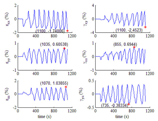 The bottom flange at the northwest of the second specimen, which is marked with NWB_2, was selected to analyze the strain response. This was validated by a test showing that the weld root on the beam flange plate of the welded connection is in a position where fatigue cracks are likely to initiate. From the experiment, it was observed that under cyclic loading with a constant displacement amplitude, the tiny visible crack in NWB_2 was initiated just after the 7th cycle, i.e., at the time period between the 7th and 8th cycle. Strain data are obtained by placing three strain rosettes at the three coordinate planes in the vicinity of the weld root. Three normal strains and three shear strains of the weld root are then calculated using the elastic mechanics theory. The extracted strain response time history curves of NWB_2, ranging from the beginning of the trial to crack initiation, are drawn in Figure 8.