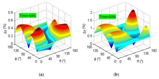 The shear and normal strains on the candidate material plane can be expressed as a function of time as Equation (6). Then, the shear strain range acting on the candidate material plane in the current cycle can be calculated to determine the maximum shear strain range and the location of the plane. For the weld root of NWB_2, the distribution curve surfaces of the critical plane at different times are shown in Figure 11.