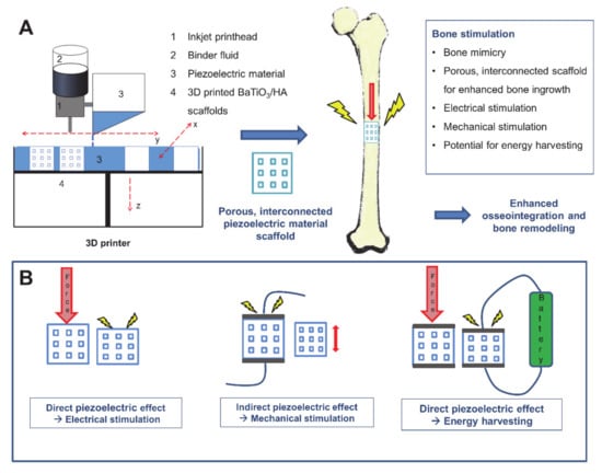 Overview of 3D printing of piezoelectric materials for bone stimulating implants. (A) shows exemplarily the binder jetting process used for the fabrication of piezoelectric scaffolds. (B) indicates different applications of the piezoelectric effect for bone stimulation. Piezoelectric implants have the potential to stimulate electrically (direct piezoelectric effect), mechanically (indirect piezoelectric effect) or could be used as an energy harvesting device to power other implants or sensors.