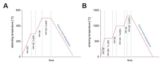 Thermal post-treatment was performed to remove the polymeric phase from the samples and to solidify and densify the composite ceramic. The polymeric phase was removed via pyrolysis from the scaffolds (debinding) by heat-treating in a debinding furnace (L9R, Nabertherm GmbH, Lilienthal, Germany) at 300 °C for 1 h and at 500 °C for 2 h (Figure 3A). In a final step, the debound green parts were subjected to a subsequent sintering treatment at 600 °C, 1000 °C and 1320 °C at atmosphere (Figure 3B).