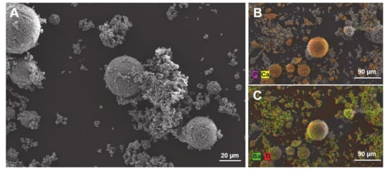 SEM image of the BaTiO3/HA powder mixture used for the 3DP process (A, scale bar: 20 µm). Elementary classification by EDX spectroscopy for HA (B, scale bar: 90 µm) and BaTiO3 (C, Scale bar: 90 µm).