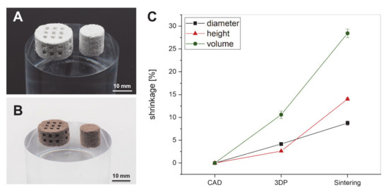 Three-dimensional (3D) printed cylindrical and interconnected scaffolds from BaTiO3/HA composite prior to debinding and sintering (A, scale bar: 10 mm) and afterward (B, scale bar: 10 mm). The shrinkage of the BaTiO3/HA scaffolds classified into fabrication process (3DP) and sintering, representing the fidelity of the printing process and the impact of thermal post-treatment (C).
