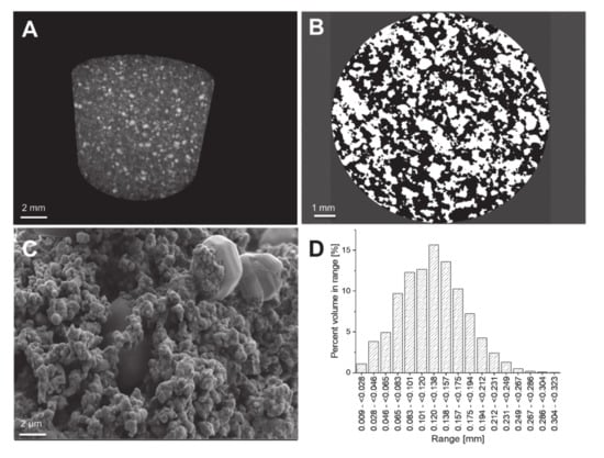 (A) Three-dimensional maximum intensity projection (MIP) of a BaTiO3/HA scaffolds with visible particles of different densities (scale bar: 2 mm); (B) The binarised cross-sectional microCT images reveal the number of pores (black) and provide the basis for a 3D calculation of porosity (scale bar: 1 mm). (C) The SEM images underline the results visible in the microCT of a highly porous network of particles which are roughly sintered. Large particles of HA are embedded in a percolating network of BaTiO3 particles through the whole scaffold (scale bar: 2 µm); (D) The pore size distribution of a 3D printed BaTiO3/HA scaffold.