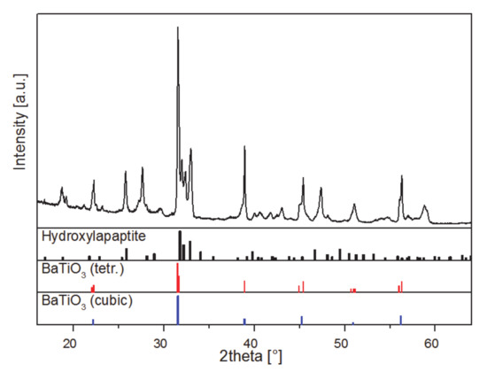 The phase composition of the 3D-printed and sintered BaTiO3/HA-composite is determined by X-Ray diffraction. The pattern, displayed in Figure 7, of the sintered composite, is quite complex, making a distinct identification of the present phases difficult. Due to the elevated sintering temperature of 1320 °C phase transitions, decomposition reactions and ion substitution are very likely to occur [31]. Especially divalent ions, such as the Ca2+ ions of the HA are known as a-site modifiers in barium titanate [32]. However, besides HA (pdf 01-076-8436, ICDD, 2016) and the BaTiO3 within its cubic modification (pdf 01-081-8524, ICDD, 2016) the tetragonal modification of BaTiO3 is identified, which is the most important phase to maintain piezoelectric properties [32]. The XRD patterns of the raw materials are listed in the supplements to demonstrate the purity of the raw materials and the changes to the final composite. Both diffractograms show the high purity of the starting materials for BaTiO3 and HA respectively (Figure S1).