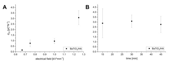 Piezoelectric coefficient d33 in dependence of the applied polarization field (A) and polarization time (B).