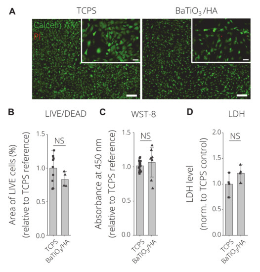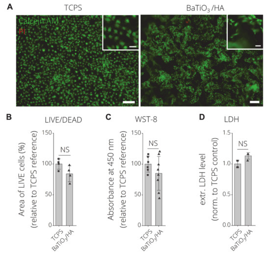 Figure 9 depicts the viability results of the indirect cell viability test using BaTiO3/HA eluates in comparison to tissue culture polystyrene (TCPS) as positive control (DMSO (6%) as neg. ctrl. see Figure S2). Fluorescence microscopy (FM) images of Calcein AM/Propidium iodide LIVE/DEAD staining MC3T3-E1 cells depict majorly live (green) cells with spread morphologies incubated on TCPS and with BaTiO3/HA eluates (Figure 9A). Slight less spreading of cells, cultured with BaTiO3/HA eluates, is observed. The quantification of the area of live cells per group reveals no statistically significant difference between TCPS and BaTiO3/HA samples (Figure 9B), while the sensitivity of MC3T3-E1 cells towards cytotoxic conditions was proven in DMSO 6% conditions (Figure S2) with significantly reduced area of live cells in comparison to both, TCPS and BaTiO3/HA. WST-8 viability tests demonstrate no significant difference in viability comparing TCPS and BaTiO3/HA samples (Figure 9C). Intracellular LDH levels are in accordance with those findings, showing significantly higher LDH levels in comparison to DMSO 6%, which correlates to the number of cells per condition. Similar to LIVE/DEAD FM and WST-8 results, there is no significant difference in the number of cells comparing TCPS and BaTiO3/HA eluate groups. The results indicate no cytotoxic effects of eluates derived from the BaTiO3/HA composition that were investigated in this study. Baxter et al. (2009) assessed human osteosarcoma cells on BaTiO3/HA substrates similar to those that were 3D printed in our study [36]. The group found no indication of cytotoxicity from their materials [36]. Liu et al. (2016) observed cellular growth on MG-63 cells on BaTiO3/HA composite materials of different porosities [37]. Zhang et al. (2014) performed similar eluate tests according to ISO 10993 using L929 cells on BaTiO3 based piezo ceramics [8]. Based on 3D printing-processed BaTiO3/HA composite, we demonstrate that our tests possesses no in vitro cytotoxic properties, which is in accordance with those previous findings [8,36,37].