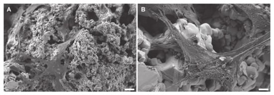 Acosta et al. (2017) showed that the interaction of ferroelectric and piezoelectric materials even with a simple cell line (mouse embryonic fibroblasts) is very complex [38]. Figure 10 shows the direct cytocompatibility assessment of MC3T3-E1 seeded for 24 h on 3D printed BaTiO3/HA samples. LIVE/DEAD fluorescence images reveal majorly live cells on both, TCPS and BaTiO3/HA substrates (green fluorescence) (Figure 10A). MC3T3-E1 cells show attachment and high viability on the 3D printed BaTiO3/HA substrate, with no statistically significant difference between TCPS and BaTiO3/HA in area of live cells (Figure 10B), viability (WST-8) and extracellular LDH level (Figure 10C,D). Scanning electron microscopy micrographs show spread cell morphologies of MC3T3-E1 cells and attachment on the BaTiO3/HA surfaces (Figure 11A), similar to non-printed substrates as described before [36,37]. Liu et al. (2016) observed the spreading of MG-63 cells in porous BaTiO3/HA composites, easily spreading over gaps exceeding 10 µm [37]. We observe the same potential of wide spreading morphologies and cell-material interaction of MC3T3-E1 cells on 3D printed BaTiO3/HA scaffolds, bridging over surface roughness introduced by the printing process (Figure 11A,B, Figure S3).