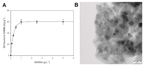In order to appreciate the tendency of the SAMN–XO system to spontaneously evolve into a nanohybrid, naked magnetic nanoparticles were tested for the recovery of the enzyme from the aqueous milieu: XO (0.2 µM) was incubated in the presence of increasing concentrations of SAMNs, ranging from 0.1 to 5.0 mg mL−1, and, after 1 h incubation, the magnetic nanomaterial was retrieved by the application of an external magnet. The enzymatic activity, under substrate saturation conditions, was used to estimate the concentration of XO in solution, and therefore to calculate the amount of bound enzyme. The amount of immobilized XO on SAMNs followed an exponential rise to a maximum value (see Figure 1A) as a function of SAMN concentration. The curve reached a plateau at around 1.0 mg mL−1 SAMN, corresponding to a XO/SAMNs mass ratio of 60 µg XO mg−1 SAMN, which was in good agreement with the protein loading reported in previous studies [20].