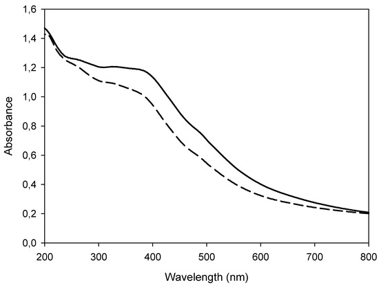 UV-Vis spectra of naked SAMNs and of the SAMN@XO complex. Measurements were carried out in water. Solid line: 0.1 g L−1 naked SAMNs; Dashed line: 0.1 g L−1 SAMN@XO.