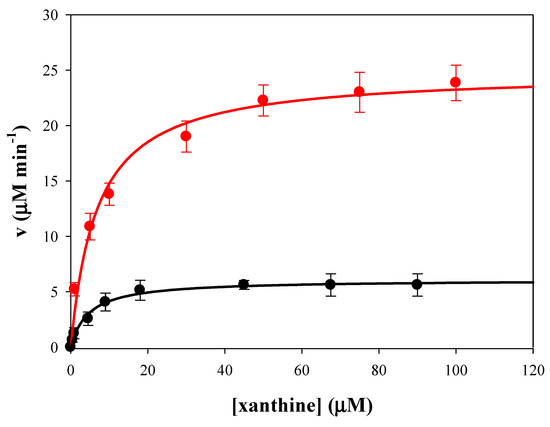 Comparison of enzymatic activity of native (black line) and immobilized Xanthine Oxidase (red line). Measurements were carried out in 50 mM potassium phosphate buffer, pH 7.5, at 25 °C in the presence of 51 nM XO (0.25 mg mL−1 SAMN@XO, 60 µg XO mg−1 SAMNs).