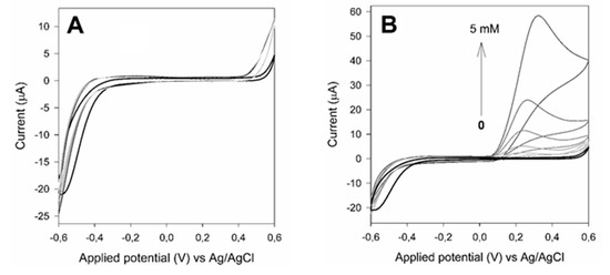 Cyclic voltammetry of graphite screen-printed electrodes (GSPEs) modified with SAMNs in the presence of xanthine (A) and uric acid (B). Measurements were carried out by dropping 2 µL of a suspension of 0.25 mg mL−1 SAMN in 50 mM phosphate buffer, pH 7.5. Scan speed, 20 mV s−1. Black line: no substrate.