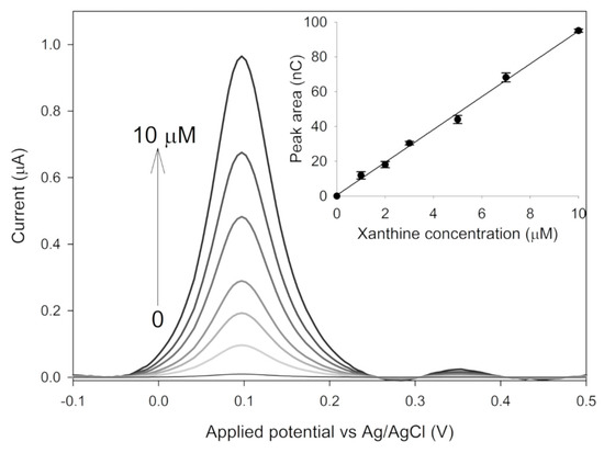 Differential pulse voltammetry was used as a sensitive electrochemical technique for the quantification of uric acid produced by the enzymatic reaction. The different applied peak potential of SWV with respect to CV measurements was likely due to the lower concentration of uric acid and to the different electrode modification (see hereafter), which resulted in negligible diffusion related issues. The modified electrodes were prepared by magnetically immobilizing the nano-hybridy dropping 2 µL, 4 µL and 8 µL of a suspension of 0.25 mg mL−1 SAMN@XO. The enzymatically produced uric acid was detected at +0.1 Vvs Ag/AgCl as a function of xanthine concentration, in agreement with measurements by cyclic voltammetry. The best analytical performances were obtained by depositing 2 µL of the SAMN@XO hybrid on the GPCE. The device showed a linear response in the 1–10 µM xanthine concentration range, displaying a sensitivity of 9.40 ± 0.25 × 10−9C µM−1 and a detection limit (S/N 3, according to [31]) of 0.1 µM (see Figure 5).