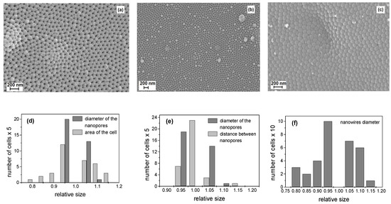 Figure 1 shows a top view SEM image of the nanopores’ geometry in the AAO template before filling with potassium niobate. Figure 2a–c shows the top view of the AAO after 30, 45, and 60 min of KNbO3 sputtering, which resulted in different degrees of gradually-filling nanopores—from fully opened (Figure 2a), through partially opened (Figure 2b) to fully closed (Figure 2c). A histogram of the relative nanopore diameters and cell areas (nanopores and separating walls), with respect to the theoretical values in nanometers [26], is shown in Figure 2d. It should be noted that most of the nanopores had a geometry close to the theoretical predictions, with 95% coincidence. Figure 2e presents a histogram of the nanopores’ diameters and the distance between the nanopores after partial filling with potassium niobate. The distribution is relative to the theoretical values when the assumption is for a 50% filing degree. It can be seen that the major portion of cells exactly fit in the geometry of the theoretical prediction. Figure 2f shows the relative distribution of the produced nanowires, which fully fill the nanopores. According to the histogram, most of the nanopores are characterized with 95% filling and those showing relative diameter greater than one are due to irregular formations, or particle heaping, which hinder correct recognition of the surface objects by the software.