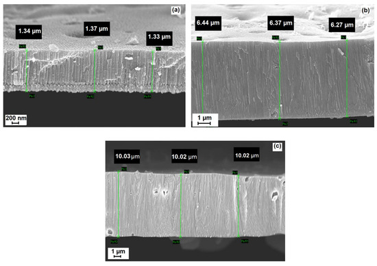 A cross-sectional view of the nanowires grown in the pores and having three different lengths are shown in Figure 3a–c. The resulting nanowires were densely arrayed, and good vertical alignment was found. Some defects, due to the membrane break, appeared in the images. The nanowires’ diameters of approximately 150 nm were rather identical in all types of samples, no matter the length. This is possible because template-assisted growth supports good regularity.