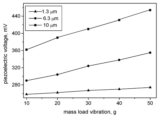 As can be seen from Figure 5, the sensor exhibited a response with excellent linearity with respect to the mass loading in all three cases. Increasing the length of the piezoelectric nanowire resulted in increasing the sensitivity in the studied range of load, as can be noted from the slopes of the characteristics. This is in good agreement with theoretical predictions [28], as well as with the previously reported results demonstrating that the piezoelectric charge of a nanowire is proportionally induced to the length of the nanowire [29]. It was proven that at higher nanowire lengths, the flexibility of the nanostructured element is greater, so it is easier to achieve the generation of a higher output voltage, because of the greater deflection of the nanowires [30]. Structures with nanowire lengths of 1.3 µm showed 0.4 mV/g, nanowire lengths of 6.3 µm showed 1.7 mV/g, and nanowires lengths of 10 µm showed 2.3 mV/g (aspect ratio varies between 5 and 40).