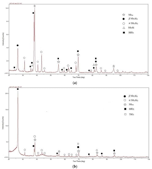 Macrosegregation of Si (MACSi) existed in both alloys. The latter is defined as MACSi = CmaxSi − CminSi where CmaxSi and C minSi, respectively are the maximum and minimum Si concentrations in the cast alloy [,]. The MACSi values were 5.6 and 4.9 at.% for the alloys JZ1 and KZ2, respectively. In Nb-silicide-based alloys, the increase of MACSi has been correlated with the increase and decrease of specific alloy parameters [,] and such trends have been confirmed in Nb-silicide-based alloys with a wide range of alloying additions and concentrations [,]. To our knowledge, there is no data about the macrosegregation of Si in Nb-silicide-based alloys with Ta or W, and Ge or Sn as alloying elements that would allow studying the parameter trends for the alloys JZ1 and JZ2.