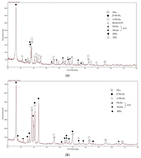 In the microstructures of the heat-treated alloys JZ1 and JZ2, the Nbss, and βNb5Si3 and Nb5Si3 were present with Ti-rich areas being present only in the Nb5Si3 silicide where the Ti+Hf content was not high enough to stabilize the hexagonal γNb5Si3. This suggests that the solid solution and the tetragonal Nb5Si3 silicides are stable in both alloys. The presence of both forms of the tetragonal Nb5Si3 is attributed to the βNb5Si3 stabilizers Ta, W, and Ge “controlling” the effect of Sn that promotes the Nb5Si3Nb5Si3 transformation. In JZ2-HT, the A15 compound was stabilized owing to the higher Sn content in the alloy compared with JZ1 as well as the presence of Ge and Si that stabilizes this structure. Based on the results for the alloy CM1 (=Nb-8.3Ti-21.1Si-5.4Mo-4W-0.7Hf) in [], it is suggested that the subgrains (Figure 3b) formed in the Nb5Si3 grains in JZ2-HT.
