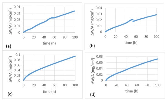 Thermogravimetric (TG) data for the alloys JZ1 (a,c) and JZ2 (b,d) for 800 °C (a,b) and 1200 °C (c,d).
