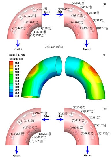 The total E-C rate and total corrosion rate are higher at the outside wall under two-phase flow, while the corrosion rate is higher at the inside wall under single-phase flow (Figure 2 and Figure 3). The corrosion rates during the FAC process are not less than those during the E-C process. Evidently, the FAC and E-C behavior are vastly different. The only distinction is that FAC is in the absence of sands, yet E-C is in the presence of sands. The sands entrained in the liquids substantially alter the hydrodynamics at the bend, leading to quite different flowing corrosion behavior under single-phase and two-phase flow.